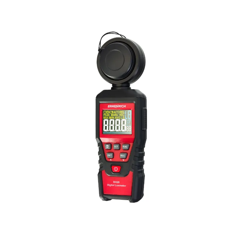 Цифровой люксметр Ermenrich Seek MX20 представляет собой современный инструмент для точного контроля уровня освещённости в самых разных условиях — от проверки рабочих помещений и учебных классов до настройки студийного света или оценки качества освещения бытовых помещений. Прибор измеряет освещённость в двух единицах — люксах и фут-свечах, что делает его удобным как для специалистов, привыкших работать по международной системе, так и для тех, кто использует альтернативные стандарты. Широкий диапазон измерений позволяет работать с очень слабым и с крайне интенсивным светом: от 1000 до 200000 люкс или от 100 до 20000 фут-свечей. Такой охват делает устройство универсальным, а точность ±(3%+5) обеспечивает достоверность полученных данных даже при измерениях в сложных условиях.